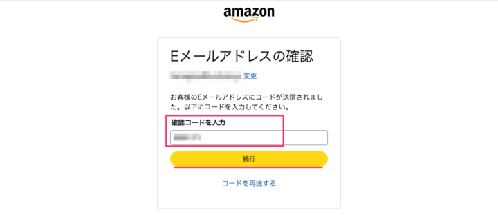 先ほど入力したEメールアドレスに「確認コート」が届くので、それを入力し「続行」をクリックします。