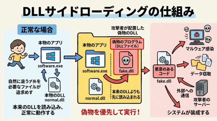 簡単に言うと、本物のソフトのすぐ隣に「偽物のプログラム(DLLファイル)」を置いておく、ソフトが起動する時に、間違えてその偽物を読み込んじゃって、裏でこっそりマルウェアが動き出す……という仕組みのことです。