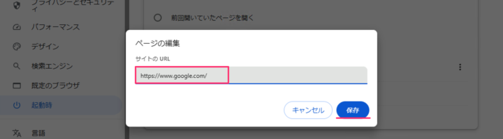 「サイトのURL」にGoogleのURLを入力し、「保存」をクリックします。
