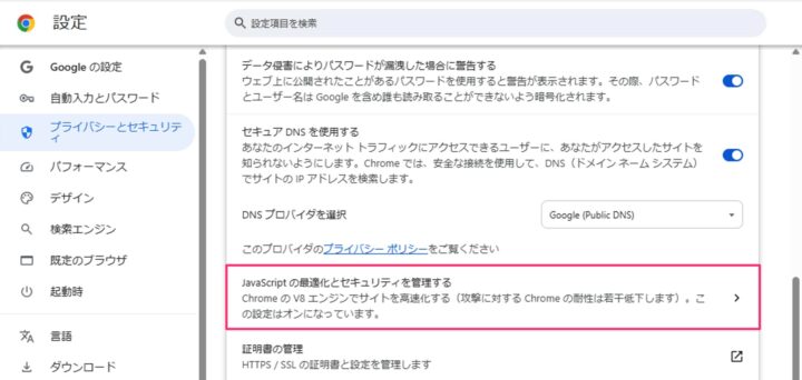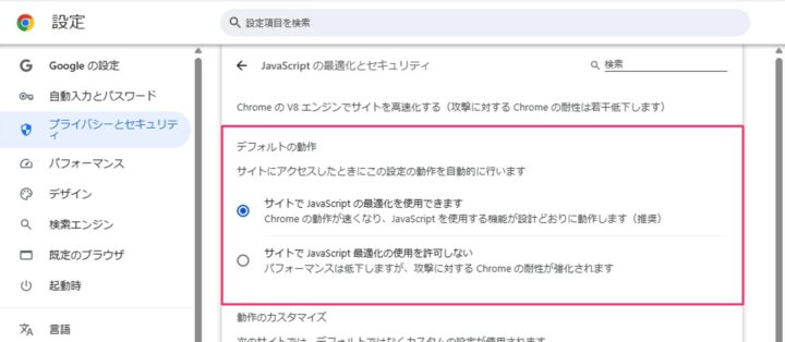 「JavaScriptの最適化とセキュリティを管理する」をクリックします。