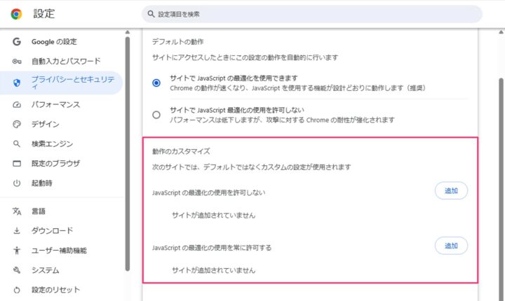 Chromeの動作が速くなり、JavaScriptを使用する機能が設計どおりに動作します(推奨) - サイトでJavaScriptの最適化を許可しない