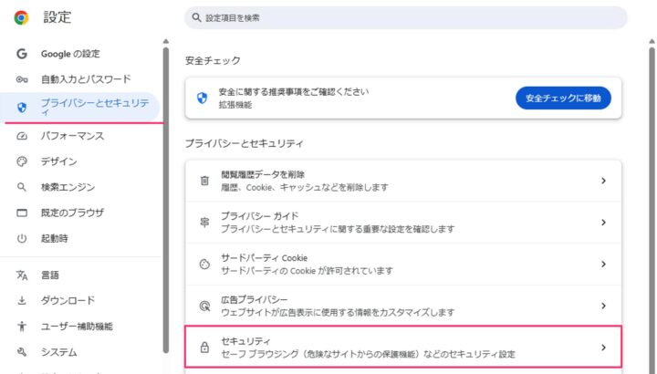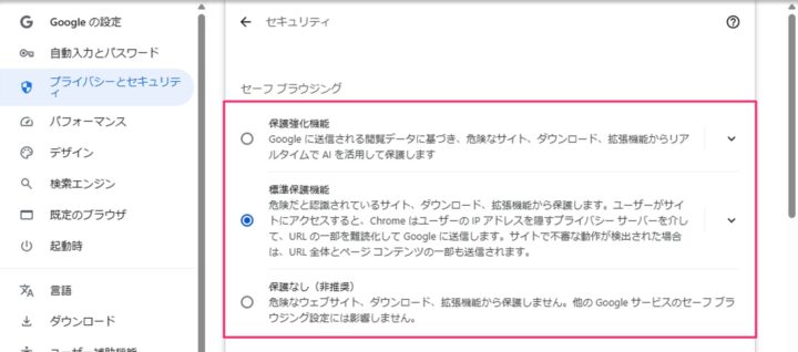 セーフブラウジングの設定です。「保護強化機能」が最も安全、「標準保護機能」がデフォルトの設定、「保護なし」は非推奨になっています。