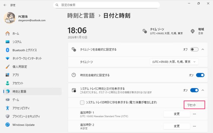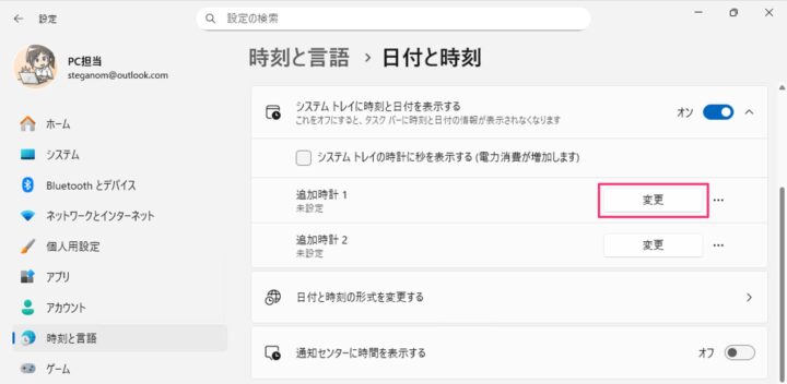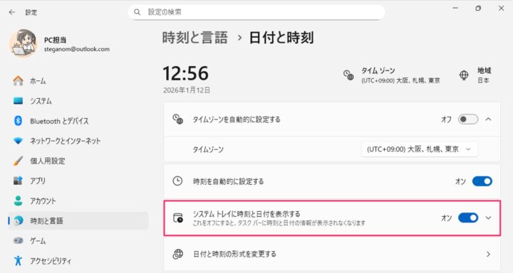「システムトレイに時刻と日付を表示する」をクリックします。