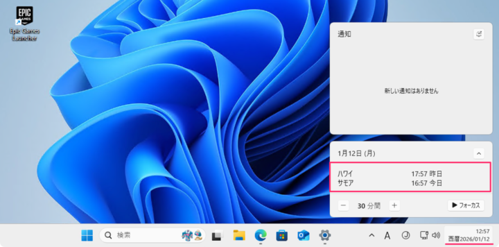 Windows11で複数のタイムゾーンの時計を表示するには、以下の操作を行ってください。