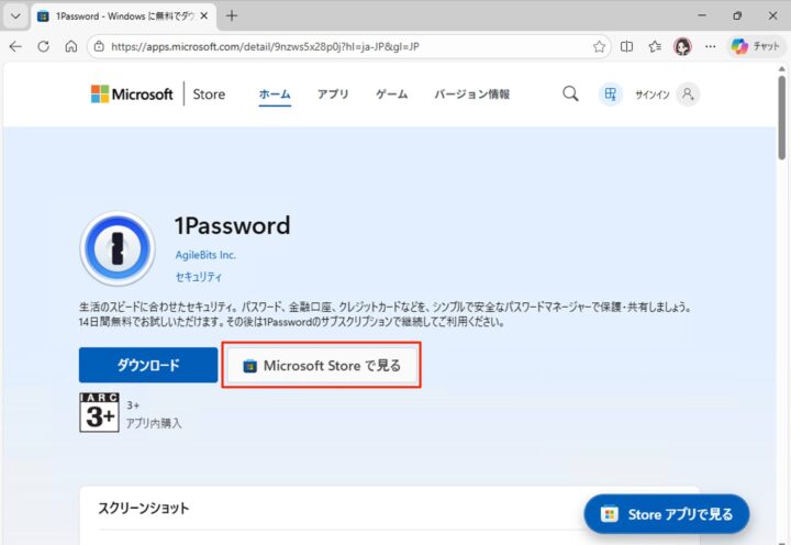 Microsoft Store(1Password)が起動したら、「入手」をクリックします。