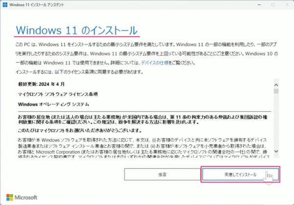 Windows 11のインストールです。「同意してインストール」をクリックしましょう。