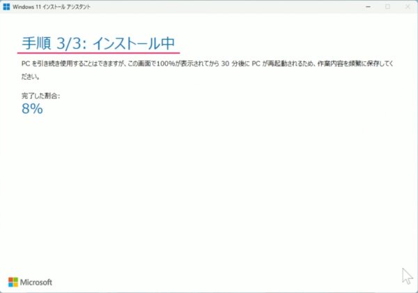 PCを引き続き使用することはできますが、この画面で100%が表示されてから30分後にPCが再起動されます。作業内容を頻繁に保存しましょう。