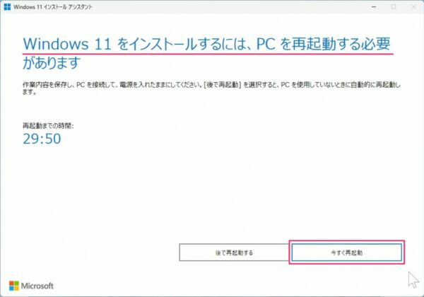 Windows 11 をアップデートするために「今すぐ再起動」をクリックします。