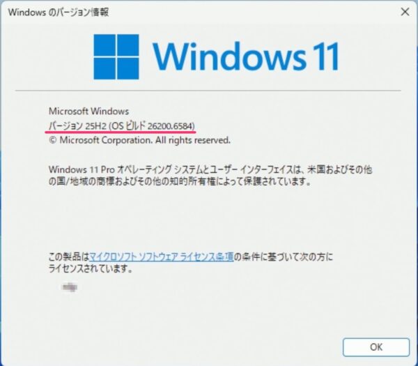 このように「バージョン 25H2」と表示されていれば、アップデート完了です。
