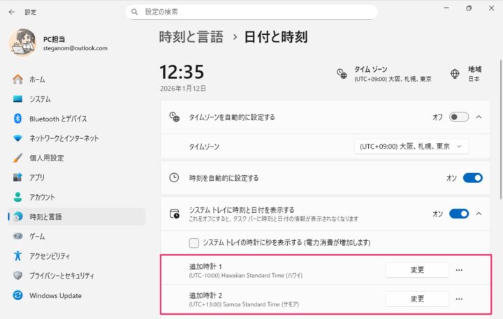 【Windows11】複数のタイムゾーンの時計を表示する方法