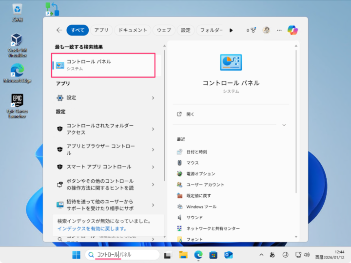 タスクバーの検索ボックスに「コントロール」と入力します。