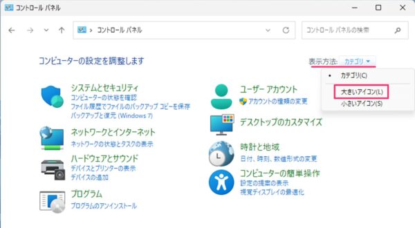 コントロールパネルです。表示方法を「カテゴリ」から「大きいアイコン」に変更します。