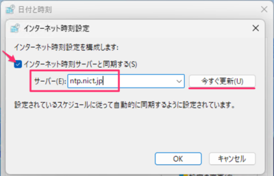 「インターネット時刻サーバーと同期する」にチェックが入っていることを確認し、サーバーに「ntp.nict.jp」と入力しましょう。