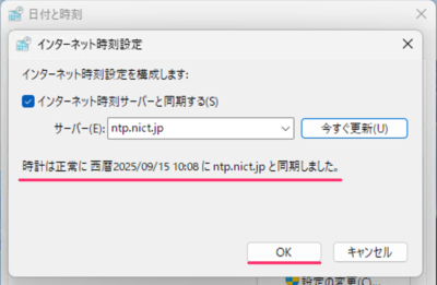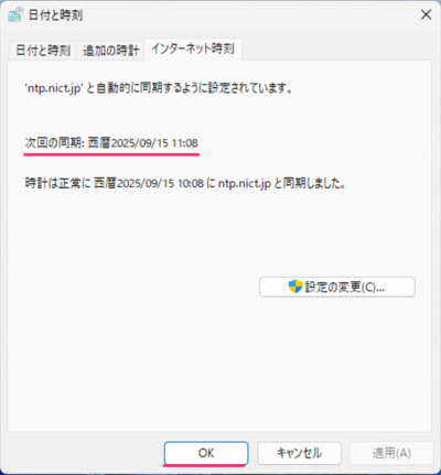 「変更したNTPサーバー」「次回の同期(日時)」が表示されるので確認しておきましょう。「OK」をクリックします。