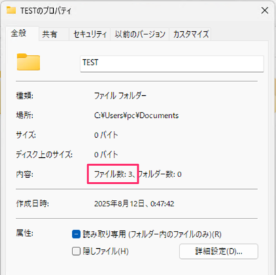 フォルダのプロパティーの内容からファイル数を確認することができます。