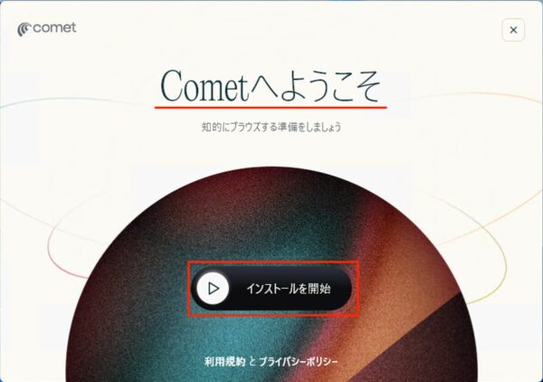 Cometへようこそ。「インストールを開始」をクリックします。
