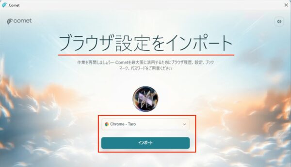 ブラウザ設定のインポートです。今お使いのブラウザを選択し、「インポート」をクリックします。