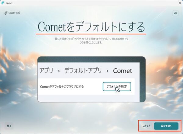 Cometをデフォルトにします。「スキップ」か「設定を開く」をクリックします。