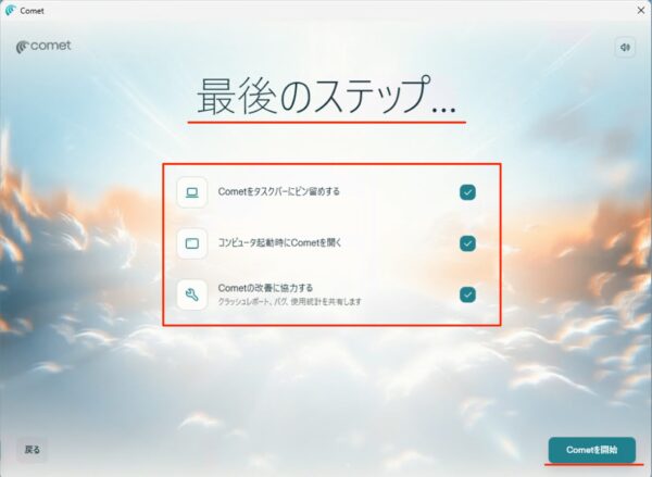 最後のステップです。必要な項目にチェックを入れ、「Cometを開始」をクリックします。