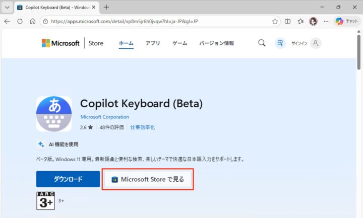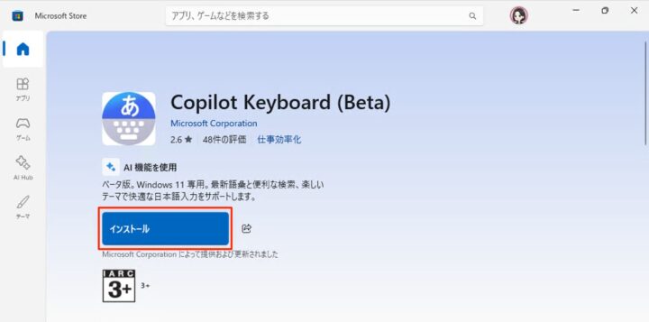 Microsoft Store(Copilot Keyboard)が起動したら、「インストール」をクリックします。