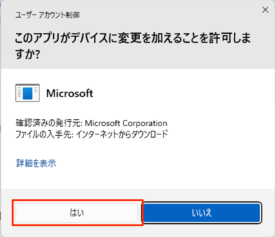ユーザーアカウント制御です。「はい」をクリックします。