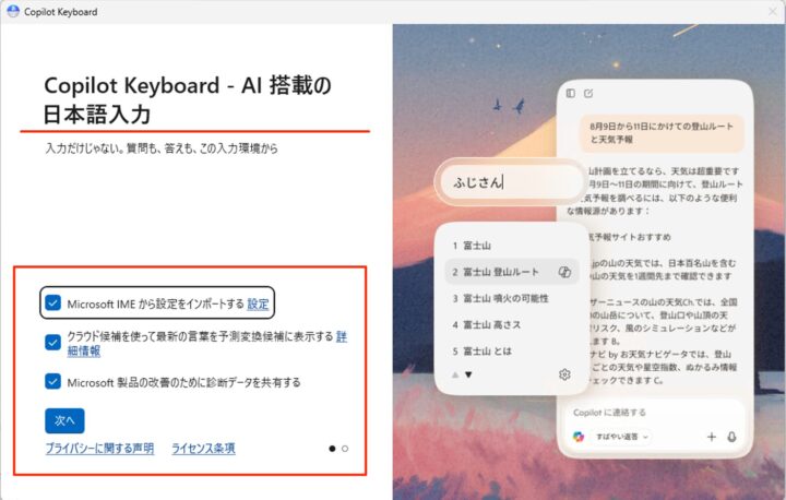 Copilot Keyboard(AI搭載の日本語入力)です。必要な項目にチェックを入れ/外し、「次へ」をクリックします。