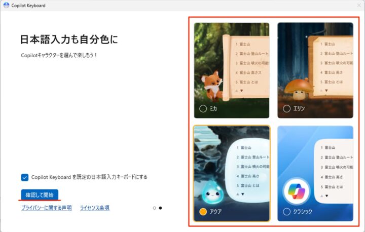 Copilotのキャラクターを選択し、「確認して開始」をクリックします。