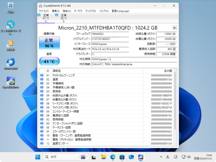 CrystalDiskInfoは、SSDやHDDの健康状態(S.M.A.R.T.情報)をチェックできる無料ソフトです。
