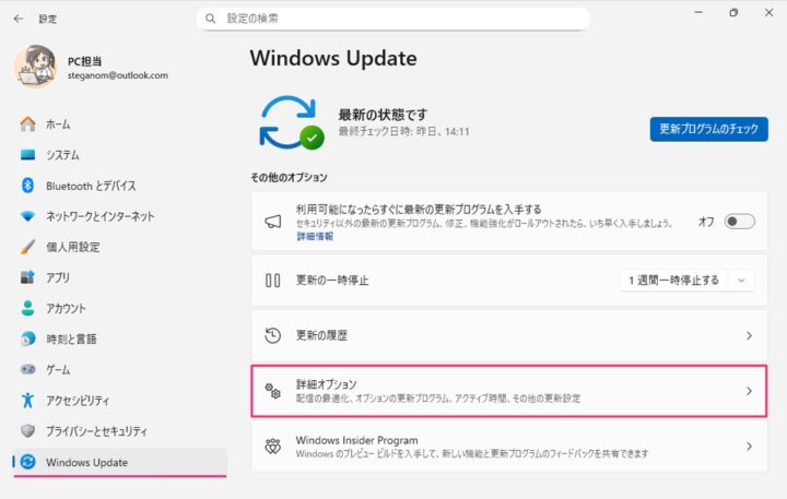 設定が開いたら、左メニューの「Windows Update」をクリックします。