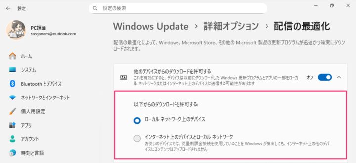 Windows11には、配信の最適化(Delivery Optimization)という機能があり、Windows UpdateやMicrosoft Store の更新データを、ほかのPCと共有して効率的にダウンロードできます。