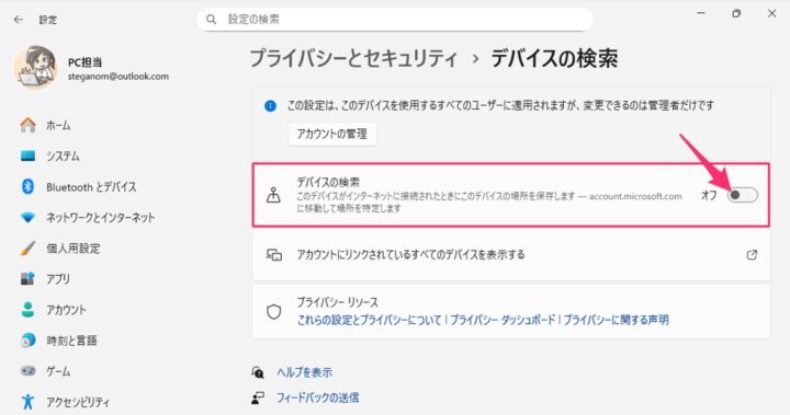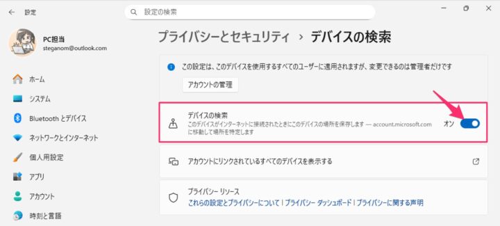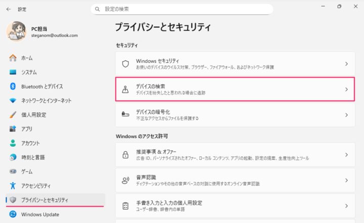 Windows11には、紛失や盗難に備えてパソコンの位置情報を追跡できるデバイスの検索機能があります。この機能を有効にしておくと、万が一PCが見つからなくなったときに、Microsoftアカウントから場所を確認することが可能です。