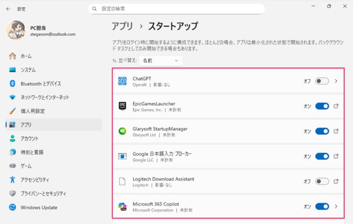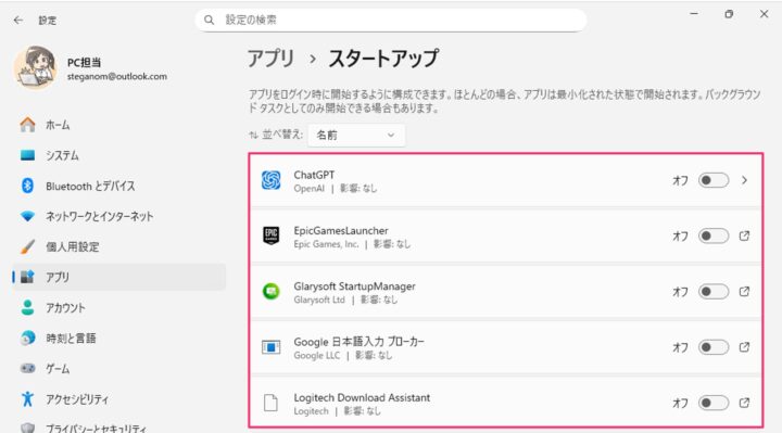 スタートアップから自動起動したくないアプリをオフにしましょう。
