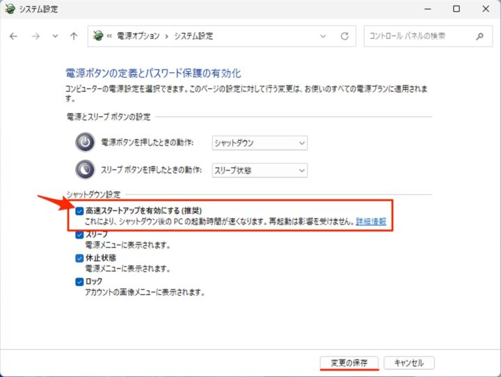 「高速スタートアップを有効にする(推奨)」にチェックを入れます。