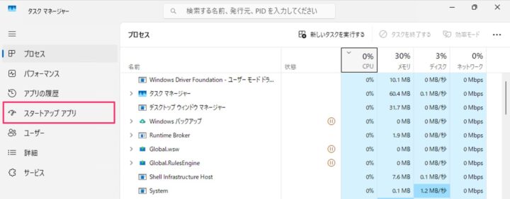 タスクマネージャーの左メニュー「スタートアップアプリ」をクリックします。