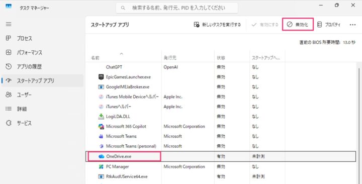 スタートアップアプリの「OneDrive」を選択し、「無効化」をクリックします。