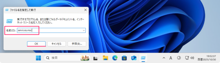 「ファイル名を指定して実行」が表示されたら名前に「services.msc」と入力し、「OK」をクリックします。