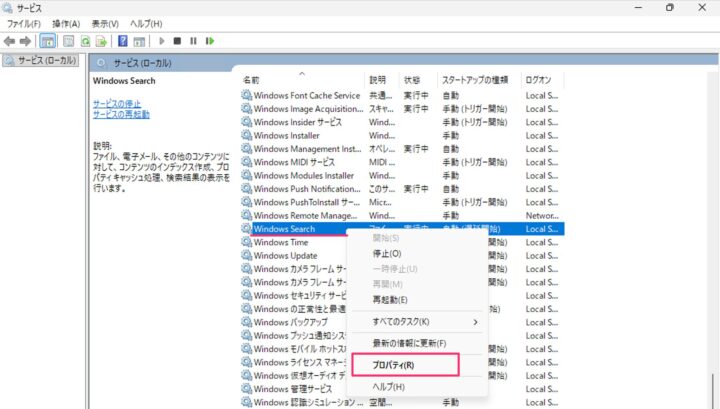 「Windows Search」を右クリックし、「プロパティ」をクリックします。