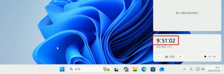 Windows11の通知センターに大きな時計・時間を表示する方法を紹介します。
