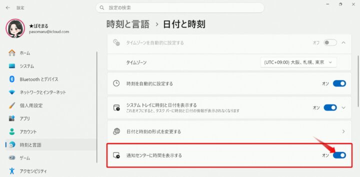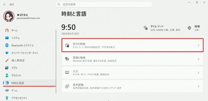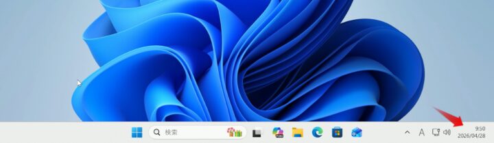 これで設定完了です。画面右下の「日付と時刻」をクリックしてみると