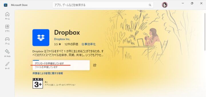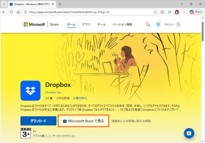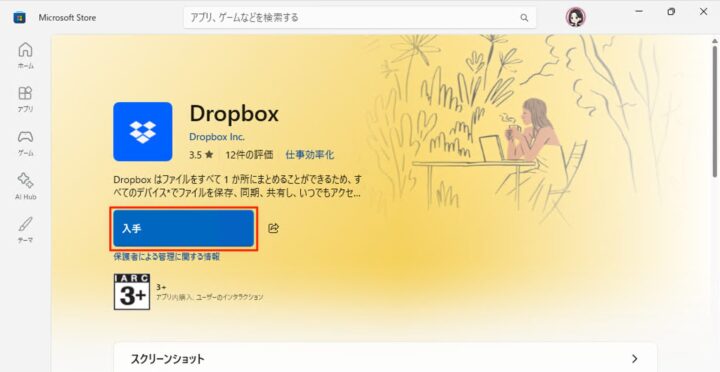Microsoft Store(Dropbox)が起動したら、「入手」をクリックします。