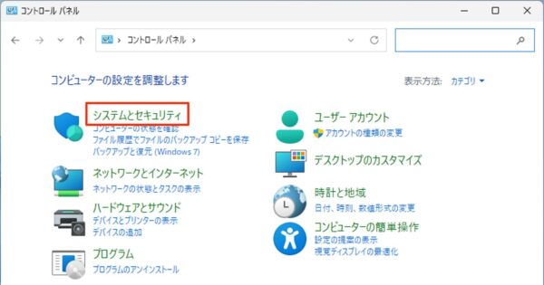 コントロールパネルが起動したら、「システムとセキュリティ」をクリックします。