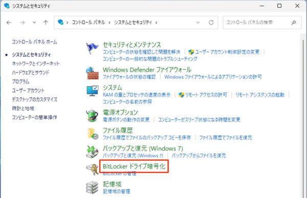 「BitLockerドライブ暗号化」をクリックします。