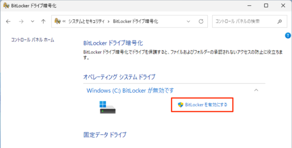 Windows11で、BitLockerドライブ暗号化を有効にするには、以下の操作手順を行ってください。
