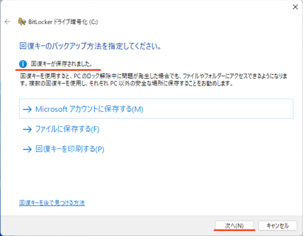 回復キーが保存されたら、「次へ」をクリックします。
