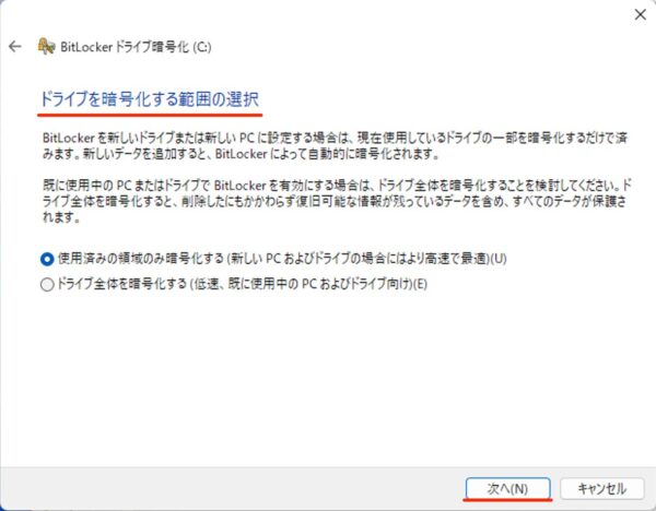 新しいドライブまたは新しいPCに設定する場合は「使用済みの領域のみ暗号化する」、既に使用中のドライブまたはPCの場合は「ドライブ全体を暗号化する」を選択しましょう。