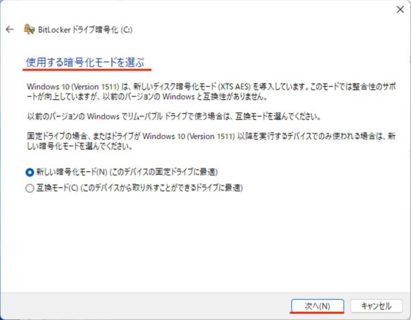 Windows10以降のデバイスであれば「新しい暗号化モード」を選択しましょう。