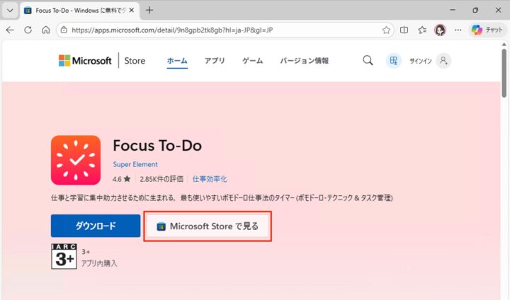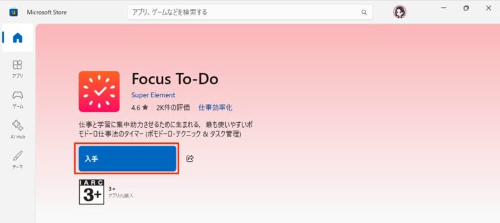 Microsoft Store(Focus To-Do)が起動したら、「入手(インストール)」をクリックします。