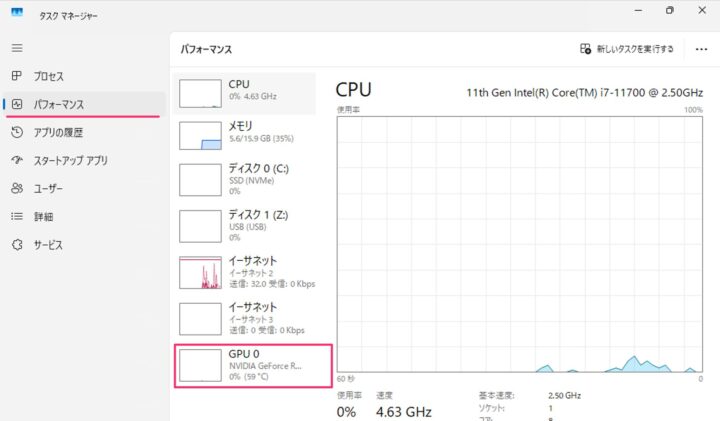 タスクマネージャーの左メニュー「パフォーマンス」をクリックします。