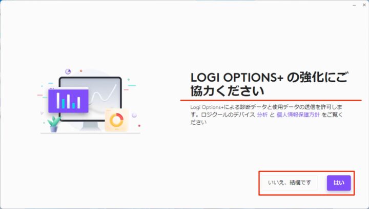 Logi Options+の強化に協力してください「いいえ、結構です」「はい」のどちらかをクリックします。
