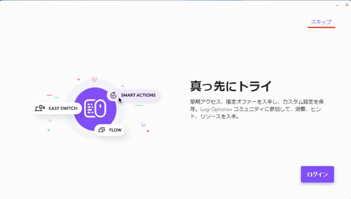 Logi Options+のログイン画面です。「スキップ」をクリックします。